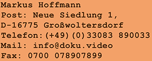 Falls Sie Fragen, Anregungen oder Wünsche zu den vorgestellten Videos und Fotos haben, können Sie gerne per Mail oder Telefon Kontakt aufnehmen. Wenn Sie überlegen, selbst ein Video oder Fotos in Auftrag zu geben, berate ich Sie gerne unverbindlich.